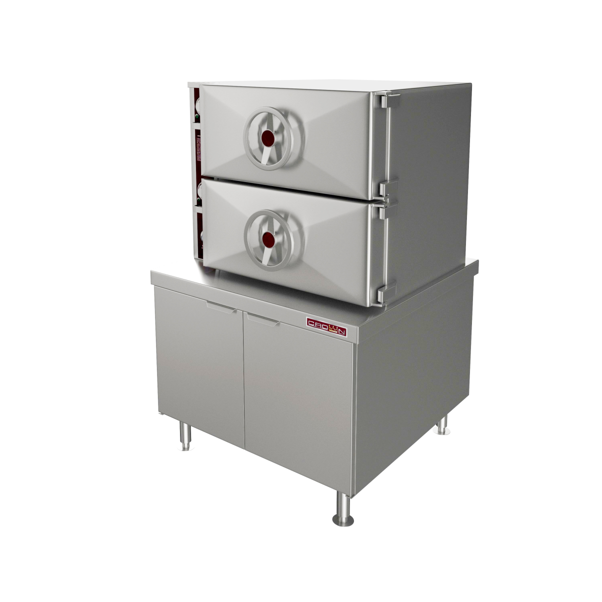 The compartment cooker is mounted on a cabinet base with a full perimeter angle frame. Thermostatically controlled cold water shall automatically condensate exhausted steam into water before releasing it to the drain. The cabinet shall be all stainless steel #4 finish type 304, hinged doors, and 6” (152mm) stainless steel legs fitted with four adjustable flanged feet for mounting to the floor.